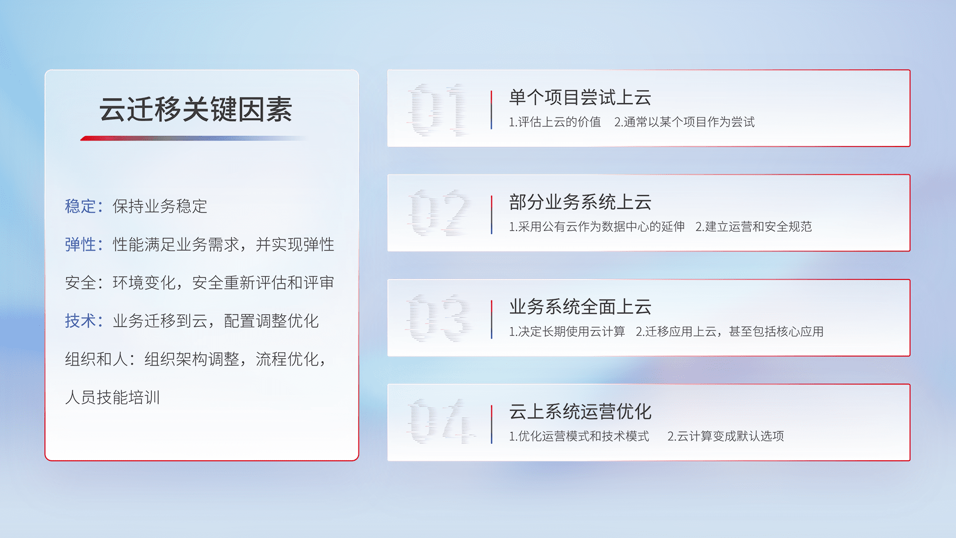 结合实际业务,,,,从规划设计、、、云平台选型、、云原生改造、、、数据迁移、、、、集成交付,,,,迁移全过程为客户识别最佳上云路径,,做好风险识别管理,,设计网络架构、、、身份权限、、安全审计合规、、、操作审计、、、日志审计、、、监控告警策略、、、、多站点容灾设计等,,对云上基础设施进行整体规划,,,提升IT治理水平,,,,以满足弹性、、、高可用、、高性能的需求。。。